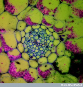 A transverse section through a root of bird’s nest orchid (Neottia sp), viewed using a confocal microscope. Cells are labelled as a result of staining with a coloured fluorescent probe and autofluorescence. The image shows the presence of fungal threads (brown/blue) in the cortex. These constitute an endomycorrhiza, a symbiotic relationship between plant and fungus in which the fungus penetrates the root tissues and contributes to its nutrition. Many of the cortex cells contain starch grains (pink) for food storage.