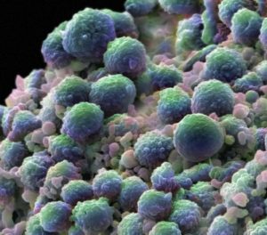 A colour-enhanced image showing a clump of prostate cancer cells.